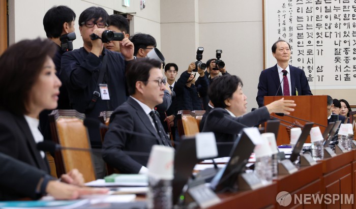 | [서울=뉴스핌] 정일구 기자 = 이완규 전 법제처장이 24일 오전 서울 여의도 국회 법제사법위원회에서 열린 법제처에 대한 국정감사에서 증인선서 거부 의사를 밝힌 가운데 국민의힘 의원들이 여당 의원들과 언쟁을 벌이고 있다. 2025.10.24 mironj19@newspim.com |
