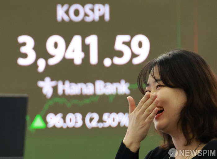 [서울=뉴스핌] 김학선 기자 = 미·중 정상회담 확정에 코스피가 3900선을 돌파한 24일 오후 코스피 지수는 전 거래일 대비 96.03p(2.50%) 오른 3941.59에 장을 마쳤다. 이날 오후 서울 중구 하나은행 딜링룸 전광판에 종가가 표시되고 있다. 2025.10.24 yooksa@newspim.com