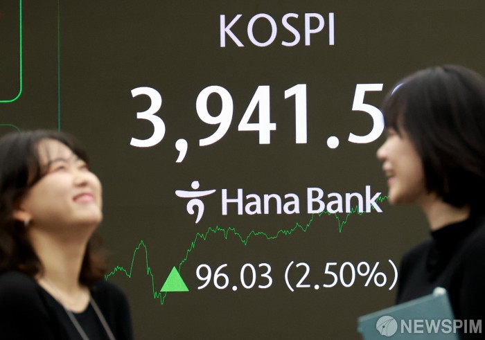 [서울=뉴스핌] 김학선 기자 = 미·중 정상회담 확정에 코스피가 3900선을 돌파한 24일 오후 코스피 지수는 전 거래일 대비 96.03p(2.50%) 오른 3941.59에 장을 마쳤다. 이날 오후 서울 중구 하나은행 딜링룸 전광판에 종가가 표시되고 있다. 2025.10.24 yooksa@newspim.com