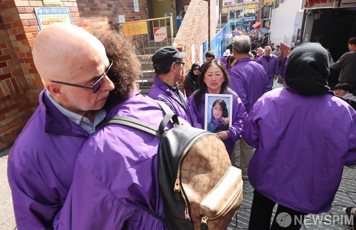 [서울=뉴스핌] 김학선 기자 = 10·29 이태원 참사 외국인 희생자 유가족들이 25일 서울 용산구 이태원역 1번 출구 앞 '10·29 기억과 안전의 길'을 찾아 참사 현장을 살펴보며 눈물을 흘리고 있다. 2025.10.25 yooksa@newspim.com
