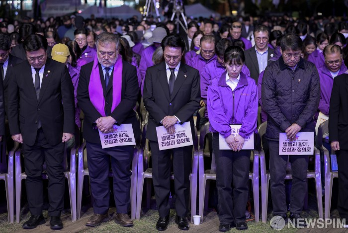 [서울=뉴시스] 정병혁 기자 = 김민석 국무총리를 비롯한 참석자들이 25일 서울 중구 서울광장에서 열린 10.29 이태원참사 3주기 시민추모대회에서 묵념을 하고 있다. 2025.10.25 jhope@newsis.com