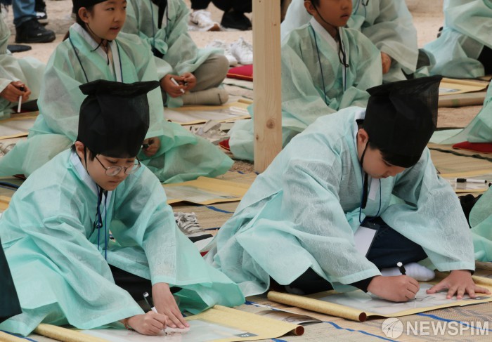 [서울=뉴스핌] 이길동 기자 = 시월의 마지막 휴일인 26일 오전 서울 종로구 창경궁 함인정 앞마당에서 열린 조선시대 유생 중양절 특별 과거시험 ‘구일제’에 참가자들이 유생복을 입고 중양절과 조선 역사, 국가유산 관련 문제를 풀고 있다. 국가유산청 궁능유적본부와 국가유산진흥원은 24일부터 26일까지 서울 창경궁에서 전통 명절 '중양절(重陽節)'을 주제로 한 '궁궐 일상 모습 재현 및 체험'을 개최했다. 2025.10.26 gdlee@newspim.com