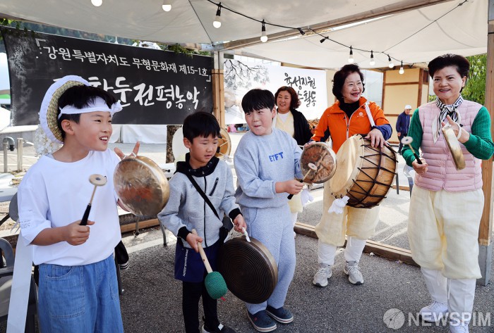 [서울=뉴스핌] 양윤모 기자 = 26일 오후 강원도 평창군 용평면 평창농악축제장 일원에서 열린 '2025평창농악축제'를 찾은 어린이들이 농악 체험을 즐기고 있다. '흥겹게 울려펴지는 우리 소리! 신명나게 즐기는 평창의 가을'이란 주제로 열리는 올해 축제는 다양한 전통 농악 공연과 체험행사등 평창의 특색있는 먹거리로 열렸다. [사진=평창군청] 2025.10.26 yym58@newspim.com