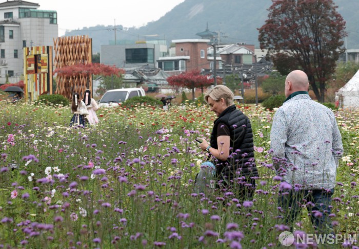 [서울=뉴스핌] 이길동 기자 = 가랑비가 내리는 26일 서울 종로구 송현열린광장에서 관광객과 시민들이 꽃길을 산책하며 가을의 정취를 만끽하고 있다. 2025.10.26 gdlee@newspim.com