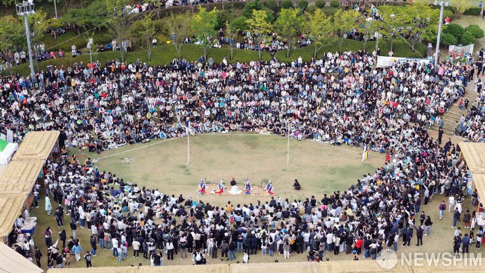 [서울=뉴스핌] 양윤모 기자 = 26일 오후 부산시 동래구(구청장 장준용)가 주최한 '제31회동래읍성역사축제' 읍성광장에서 남사당놀이 줄타기 공연이 스많은 방문객이 운집한 가운데 펼쳐지고 있다. ‘동래성 사람들, 역사와 미래를 잇다’라는 새로운 슬로건으로 열리는 올해 축제는 동래성 항전 이야기에 4차 산업 기술을 접목한 새로운 체험과 공연으로 열렸다. [사진=동래구청] 2025.10.26 yym58@newspim.com