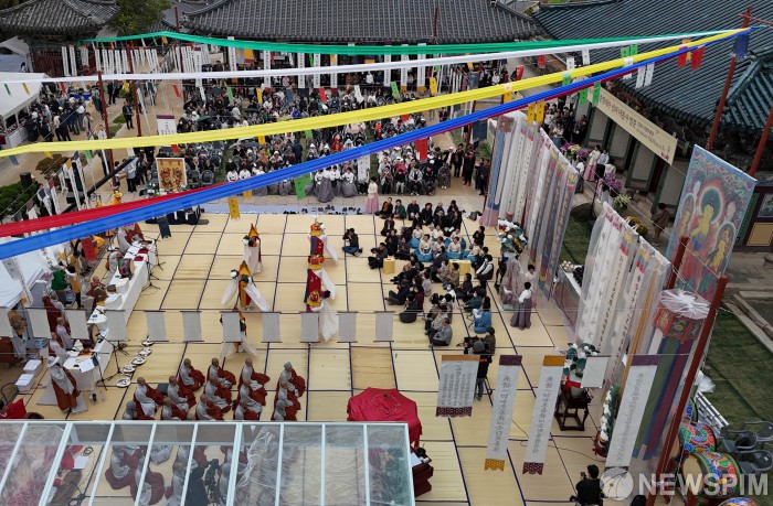 [서울=뉴스핌] 광복 80주년을 맞아 26일 서울 은평구 진관사는 국행수륙재 개건 627주년 기념 ‘2025년 진관사 수륙재’ 회향식을 봉행했다. 수륙재는 지난 7일부터 49일간 ‘광복 80년, 온 세상을 비추는 감사의 기도로’라는 주제로 진행됐다. 대웅전 야단법석에서 비구니 스님들이 조국의 독립을 위해 희생한 순국선열과 나라의 안녕, 국민들의 평안과 건강을 기원하며 한지로 만든 꽃을 들고 불교의식무용 중 하나인 착복무 춤을 추고 있다. [사진=진관사] 2025.10.26 photo@newspim.com