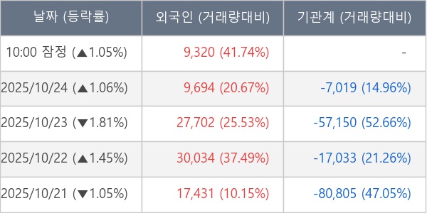 [서울=뉴스핌] 로보뉴스 = 27일 10시 15분 현재 한일시멘트(300720)는 전일 대비 1.05% (현재가 18,290원) 상승했고, 외국인이 최근 7일 연속 순매수(누적 12.03만 주, 잠정) 행진을 하고 있다.