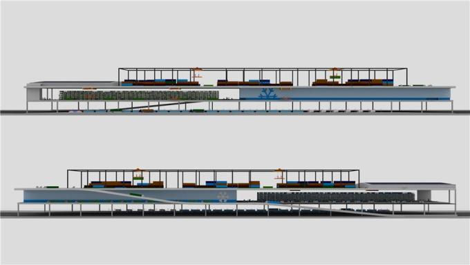 새로 개발된 모델은 상부공간이 비어 있는 철도 선로상에 3층 구조의 물류센터를 구축하는 형태다. 1층에는 화물열차가 직접 진입해 컨테이너를 하역하고, 2층에서는 오버헤드 크레인과 무인운반차(AGV)가 컨테이너를 자동으로 이동시킨다. 컨테이너 내부 화물은 2층에서 입고·보관·출고가 이뤄지고, 비워진 컨테이너는 3층 보관소로 이동한다.