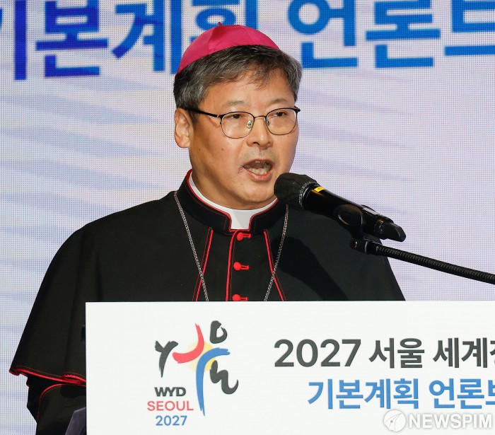 [서울=뉴스핌] 류기찬 기자 = 2027 서울 WYD 조직위원장 정순택 대주교가 27일 오전 서울 서초구 가톨릭대학교 성의교정 옴니버스파크에서 열린 '2027 서울 세계청년대회 기본계획 언론브리핑'에서 브리핑을 하고 있다. 2025.10.27 ryuchan0925@newspim.com