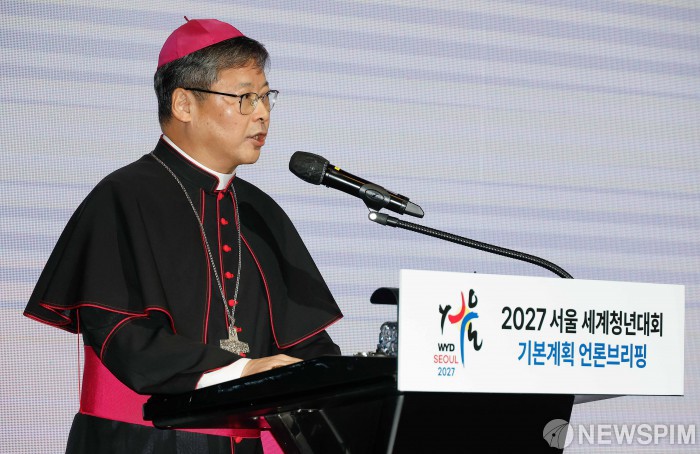 [서울=뉴스핌] 류기찬 기자 = 2027 서울 WYD 조직위원장 정순택 대주교가 27일 오전 서울 서초구 가톨릭대학교 성의교정 옴니버스파크에서 열린 ‘2027 서울 세계청년대회 기본계획 언론브리핑’에서 브리핑을 하고 있다. 2025.10.27 ryuchan0925@newspim.com