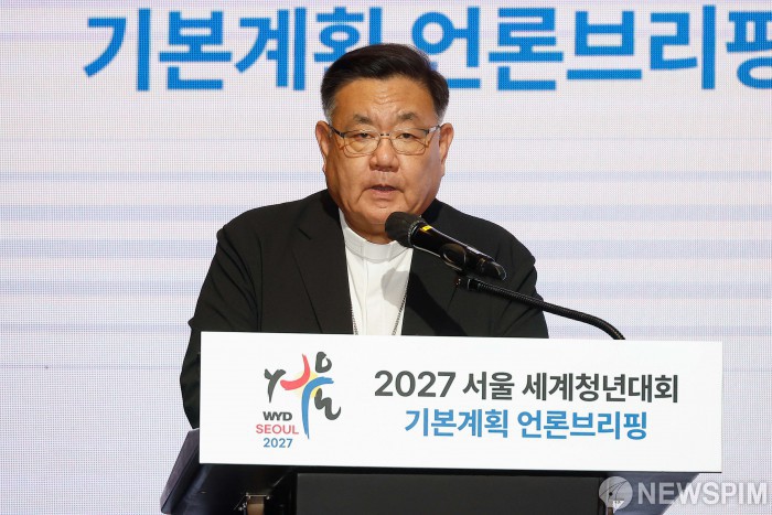 [서울=뉴스핌] 류기찬 기자 = 2027 서울 WYD 조직위원회 총괄 코디네이터 이경상 주교가 27일 오전 서울 서초구 가톨릭대학교 성의교정 옴니버스파크에서 열린 ‘2027 서울 세계청년대회 기본계획 언론브리핑’에서 브리핑을 하고 있다. 2025.10.27 ryuchan0925@newspim.com