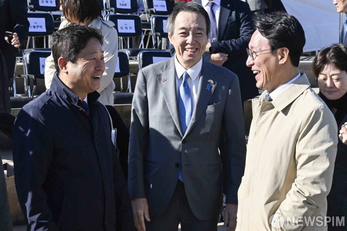 [서울=뉴스핌] 청사사진기자단 = 김민석(오른쪽) 국무총리가 27일 서울 여의도 한강공원 물빛무대에서 열린 자전거 신(新)조선통신사 출정 기념식에 참석하며 미즈시마 고이치(가운데) 주한일본대사, 김영배 국회 외교통일위원회 여당 간사와 대화를 하고 있다. 2025.10.27 photo@newspim.com