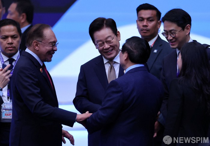 [쿠알라룸푸르 로이터=뉴스핌] 이재명 대통령이 27일 말레이시아 쿠알라룸푸르에서 열린 제26차 한-아세안 정상회의에서 안와르 이브라힘 말레이시아 총리, 팜 민 찐 베트남 총리와 대화를 나누고 있다. 2025.10.27 photo@newspim.com