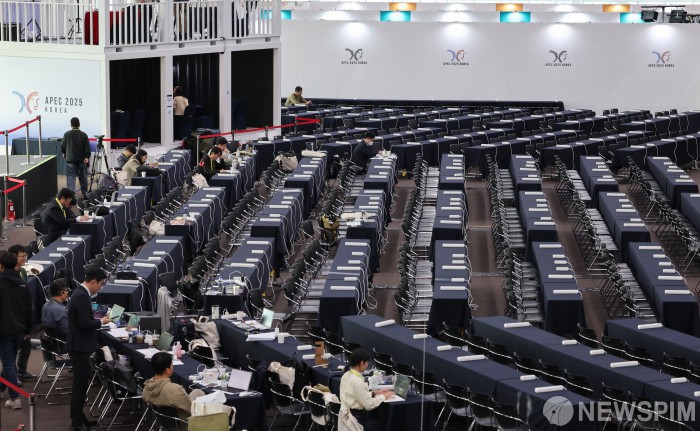 | [서울=뉴스핌] 2025 경주 아시아태평양경제협력체(APEC) 정상회의 주간이 27일 시작됐다. 사진은 개막을 하루 앞둔 지난 26일 경북 경주 보문단지 내 국제미디어센터의 모습. [사진=APEC 2025 KOREA & 연합뉴스] 2025.10.27 photo@newspim.com |