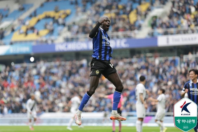 | [서울=뉴스핌] 지난 26일 인천과 경남과의 경기에서 인천의 윙어 바로우가 골을 넣고 세리머니 하고 있다. [사진 = 한국프로축구연맹] 2025.10.26 wcn05002@newspim.com |