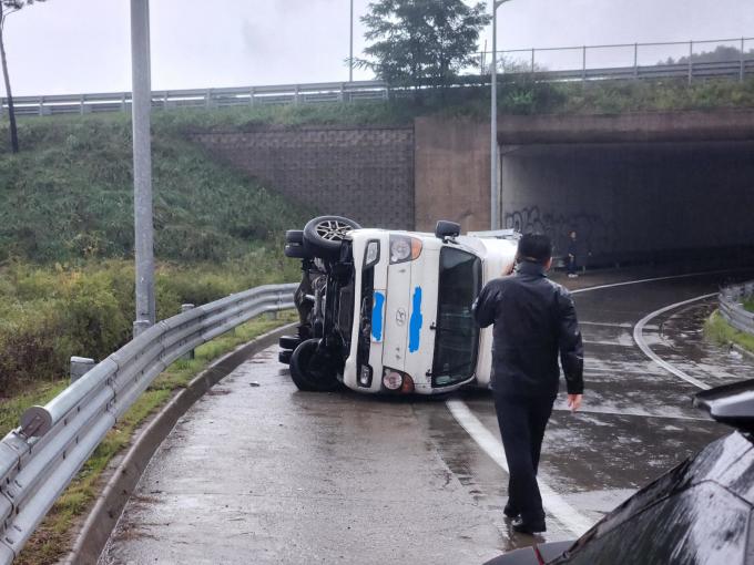 전도된 1t 화물 차량.[사진=동해지방해양경찰청] 2025.10.27 onemoregive@newspim.com