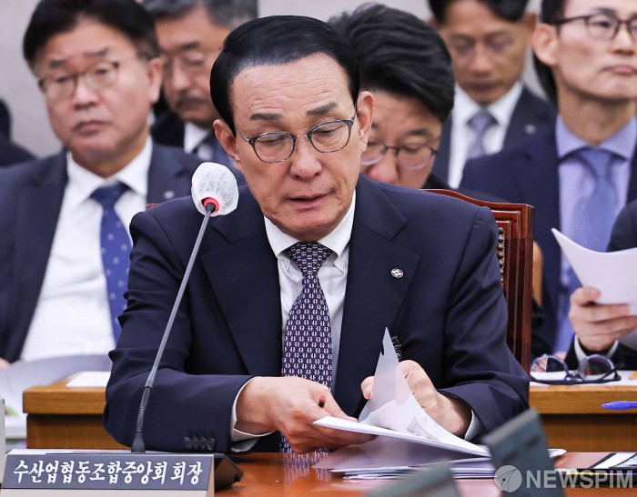 [서울=뉴스핌] 윤창빈 기자 = 노동진 수산업협동조합중앙회장이 27일 서울 여의도 국회에서 열린 농림축산식품해양수산위원회의 수협중앙회 등에 대한 국정감사에서 자료를 확인하고 있다. 2025.10.27 pangbin@newspim.com