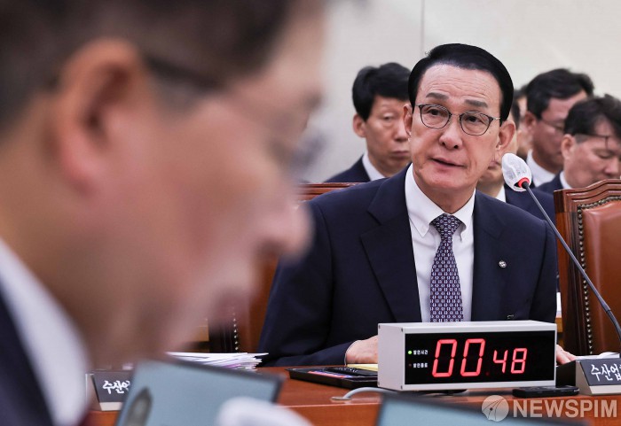 [서울=뉴스핌] 윤창빈 기자 = 노동진 수산업협동조합중앙회장이 27일 서울 여의도 국회에서 열린 농림축산식품해양수산위원회의 수협중앙회 등에 대한 국정감사에서 의원 질의에 답하고 있다. 2025.10.27 pangbin@newspim.com