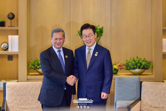 | 이재명 대통령이 27일(현지시간) 오전 말레이시아 쿠알라룸푸르에서 훈 마네트 캄보디아 총리와 정상회담에서 악수하고 있다. [사진=대통령실] |