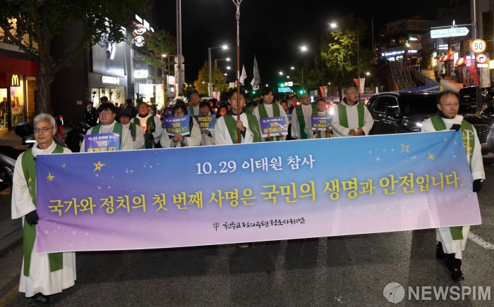 [서울=뉴스핌] 최지환 기자 = 27일 오후 서울 용산구 녹사평역 앞에서 10.29 이태원 참사 3주기 추모미사를 마치고 참석자들이 이태원역 방향으로 행진하고 있다. 2025.10.27 choipix16@newspim.com