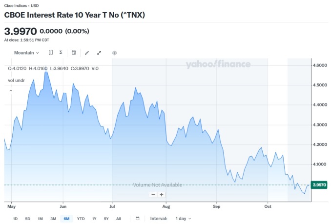 | 미 국채 10년물 차트, 자료=야후 파이낸스, 2025.10.28 koinwon@newspim.com |