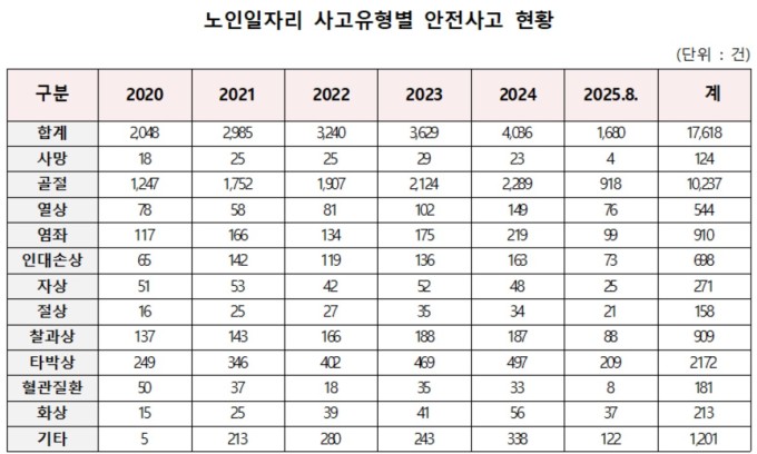 [세종=뉴스핌] 신도경 기자 = 정부가 추진하는 노인일자리 안전사고가 5년 동안 1만7618건에 달한 가운데, 안전관리 담당자 1명이 노인 150명을 관리해 인력 부족에 대한 지적이 제기된다.