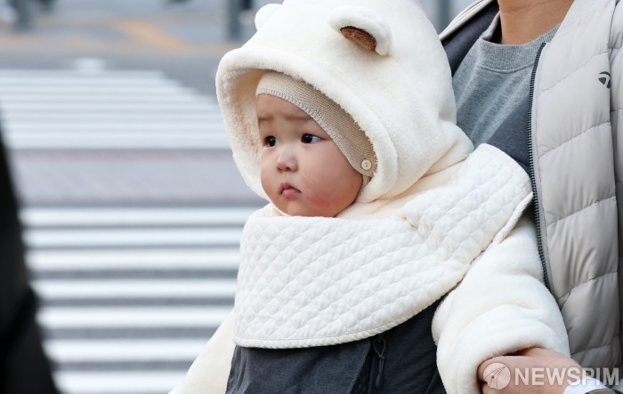 [서울=뉴스핌] 최지환 기자 = 서울 최저기온이 2도까지 내려가며 쌀쌀한 날씨를 보인 28일 오전 서울 종로구 세종대로사거리에서 한 아기가 두터운 옷과 방한용품으로 싸매고 있다. 2025.10.28 choipix16@newspim.com