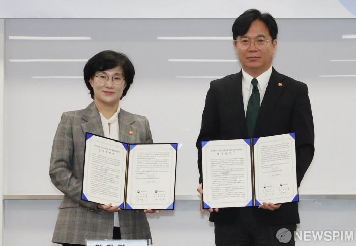 [서울=뉴스핌] 이길동 기자 = 원민경(왼쪽) 성평등가족부 장관과 김영훈 고용노동부 장관이 28일 오전 서울 종로구 정부서울청사에서 열린 고용평등 및 여성고용 정책 활성화를 위한 노동부·성평등부 업무협약식을 마친후 기념촬영을 하고 있다. 2025.10.28. gdlee@newspim.com