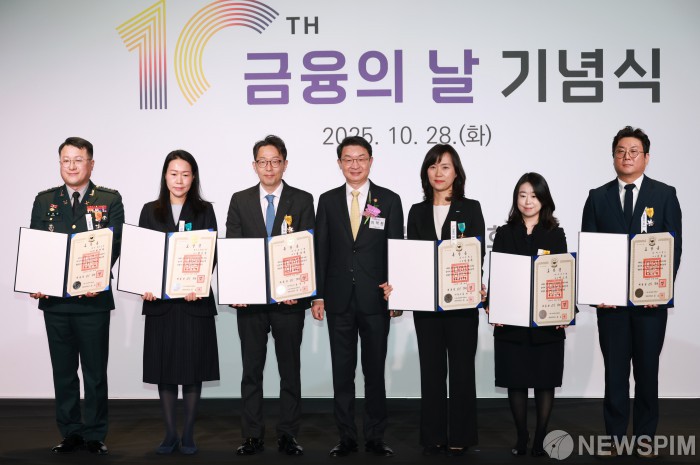 [서울=뉴스핌] 김학선 기자 = 이억원 금융위원장(가운데)이 28일 서울 여의도 FKI타워 컨퍼런스센터 그랜드볼룸에서 열린 '금융의 날 기념식'에서 훈장 및 포장 수상자들과 함께 기념촬영을 하고 있다. 왼쪽부터 정재희, 정지영, 김상용씨, 이억원 위원장, 장정희, 백소윤, 김성호씨. 2025.10.28 yooksa@newspim.com