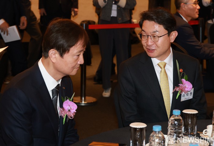 [서울=뉴스핌] 김학선 기자 = 이억원 금융위원장(오른쪽)과 이찬진 금융감독원장이 28일 서울 여의도 FKI타워 컨퍼런스센터 그랜드볼룸에서 열린 '금융의 날 기념식'에서 대화하고 있다. 2025.10.28 yooksa@newspim.com