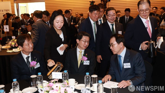 [서울=뉴스핌] 김학선 기자 = 이억원 금융위원장(가운데)과 조용병 은행연합회장이 28일 서울 여의도 FKI타워 컨퍼런스센터 그랜드볼룸에서 열린 '금융의 날 기념식'에서 대화하고 있다. 2025.10.28 yooksa@newspim.com