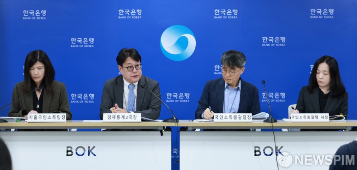 [서울=뉴스핌]이동원 한국은행 경제통계2국장이 28일 오전 서울 중구 한국은행에서 열린 2025년 3/4분기 실질 국내총생산(속보) 기자설명회에서 발언하고 있다.왼쪽부터 이현영 지출국민소득팀장, 이동원 경제통계2국장, 박창현 국민소득총괄팀장, 김선임 국민소득총괄팀 차장[사진=한국은행] 2025.10.28 photo@newspim.com