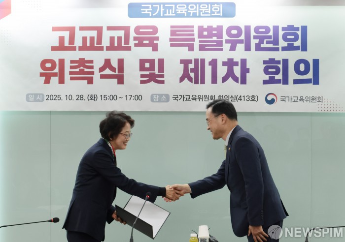[서울=뉴스핌] 이길동 기자 =차정인 국가교육위원회 위원장이 28일 서울 종로구 정부서울청사에서 열린 국가교육위 고교교육 특별위원회 위촉식 및 1차 회의에서 류방란 고교교육 특별위원회 위원장에게 위촉장 수여 후 악수하고 있다.2025.10.28gdlee@newspim.com