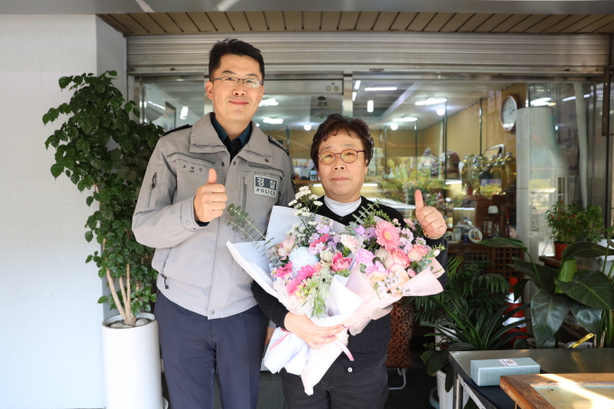 | 조현진 수원팔달경찰서이 '실종된 치매노인 발견에 도움을 준 윤모(55,여)씨에게 감사장을 수여했다.[사진=수원팔달경찰서] |