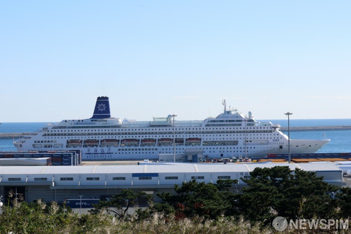 [서울=뉴스핌] 경북 경주에서 열리는 아시아태평양경제협력체(APEC) 정상회의에 참석하는 경제인들의 '바다 위 숙소'인 피아노랜드호 크루즈가 28일 포항 영일만항에 도착해 부두에 정박해 있다. [사진=APEC 2025 KOREA & 연합뉴스] 2025.10.28 photo@newspim.com