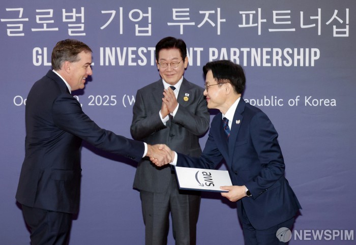 [서울=뉴스핌] 이재명 대통령이 29일 경북 경주예술의전당에서 열린 아마존웹서비스(AWS) 투자협약식에서 맷 가먼 CEO가 김정관 산업부 장관에게 투자신고서를 전달하는 모습을 보며 박수치고 있다. [사진=APEC 2025 KOREA & 연합뉴스] 2025.10.29 photo@newspim.com