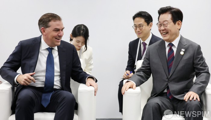 [서울=뉴스핌] 이재명 대통령이 29일 경북 경주예술의전당에서 맷 가먼 아마존웹서비스(AWS) CEO를 접견하고 있다. [사진=APEC 2025 KOREA & 연합뉴스] 2025.10.29 photo@newspim.com