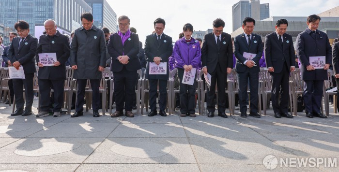 [서울=뉴스핌] 이길동 기자 = 김민석 국무총리(왼쪽에서 다섯번째)가 29일 서울 종로구 광화문광장에서 열린 10.29 이태원 참사 3주기 기억식에서 묵념을 하고 있다. 왼쪽 두 번째부터 오세훈 서울시장, 송기춘 이태원참사 특조위원장, 김 총리, 송해진 이태원 참사 유가족 운영위원장, 우원식 국회의장, 정청래 더불어민주당 대표, 장동혁 국민의힘 대표, 조국 조국혁신당 비상대책위원장.2025.10.29 gdlee@newspim.com