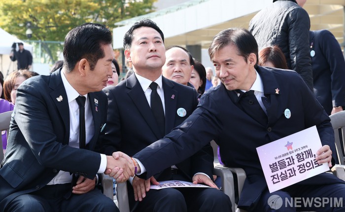 [서울=뉴스핌] 이길동 기자 = 정청래 더불어민주당 대표(왼쪽)과 조국 조국혁신당 비상대책위원장(오른쪽)이 29일 서울 종로구 광화문광장에서 열린 10.29 이태원 참사 3주기 기억식에서 악수하고 있다.2025.10.29 gdlee@newspim.com
