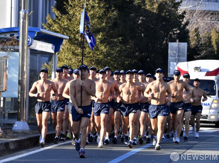 | 경남 창원시 진해구 진해만 일대에서 심해잠수사(SSU)들이 혹한기 내한 훈련의 하이라이트인 맨몸 수영 훈련을 하기 위해 맨몸 구보를 실시하고 있다. [사진=해군 제공] |