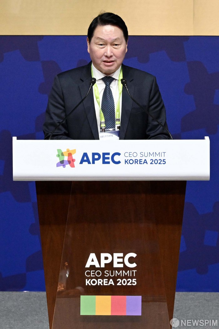 [서울=뉴스핌] 최태원 대한상의 회장이 29일 오전 경북 경주 화백컨벤션센터에서 열린 2025년 APEC CEO 서밋에서 개회사를 하고 있다. [사진=APEC 2025 KOREA & 연합뉴스] 2025.10.29 photo@newspim.com