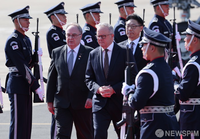 [서울=뉴스핌] 앤서니 앨버니지 호주 총리가 29일 경주 아시아태평양경제협력체(APEC)에 참석하기 위해 김해공항에 도착하고 있다. [사진=APEC 2025 KOREA & 연합뉴스] 2025.10.29 photo@newspim.com
