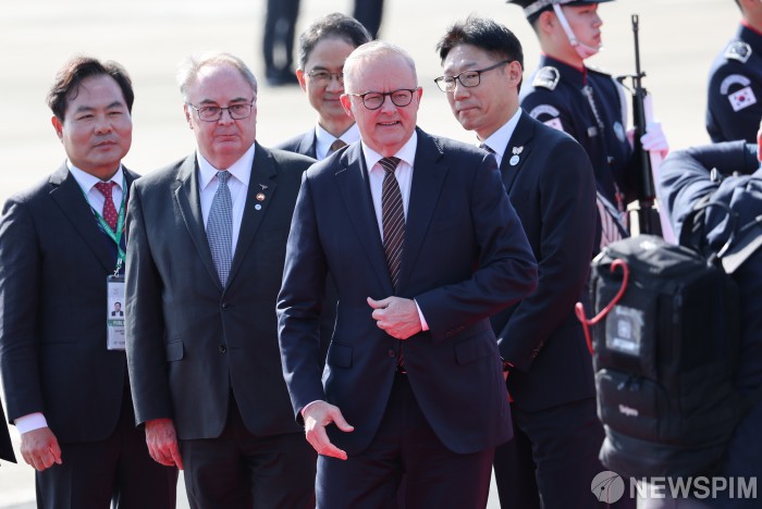 [서울=뉴스핌] 앤서니 앨버니지 호주 총리가 29일 경주 아시아태평양경제협력체(APEC)에 참석하기 위해 김해공항에 도착하고 있다. [사진=APEC 2025 KOREA & 연합뉴스] 2025.10.29 photo@newspim.com