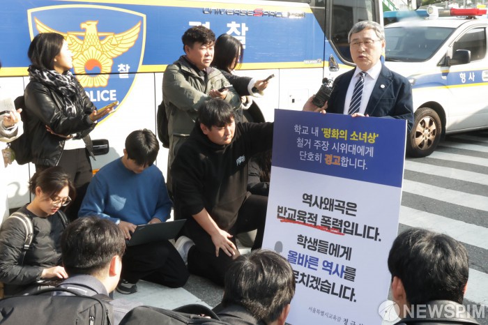 [서울=뉴스핌] 양윤모 기자= 정근식 서울시교육감이 29일 오후 서울 A고등학교앞에서 소녀상 철거를 요구하는 집회개최를 예고했던 위안부법폐지국민행동을 비난하는 기자회견을 하고 있다. 이날 위안부법폐지국민행동 등 우익단체는 평화의 소녀상이 설치된 학교 앞에서 철거를 요구하는 집회를 예고했으나 실제 이뤄지진 않았다. 2025.10.29 yym58@newspim.com