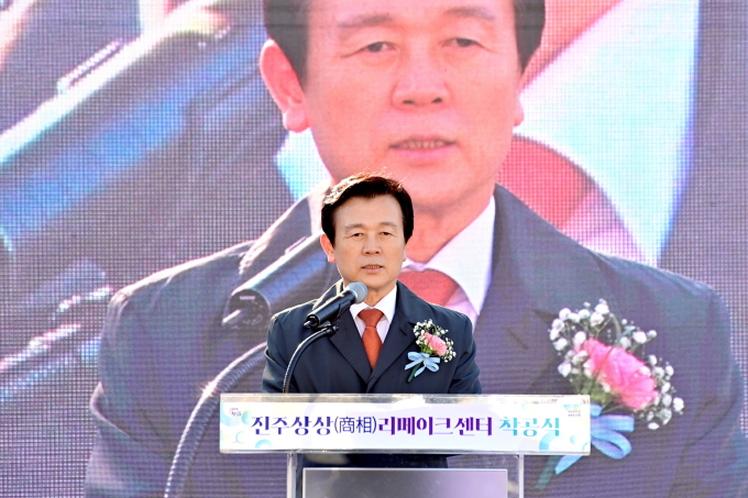 | 조규일 경남 진주시장이 29일 중앙동 논개시장 주차장에서 열린 '진주 상상리메이크센터' 착공식에서 축사하고 있다. [사진=진주시] 2025.10.29 |