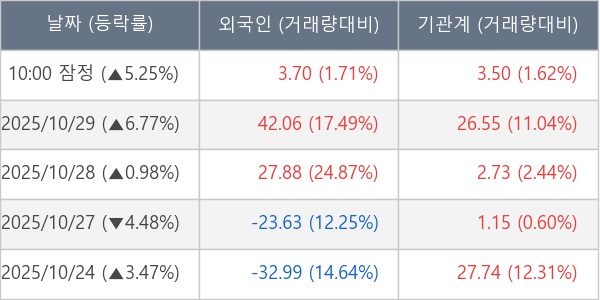 [서울=뉴스핌] 로보뉴스 = 30일 10시 15분 현재 하나마이크론(067310)은 전일 대비 5.25% (현재가 29,050원) 상승했고, 기관이 최근 6일 연속 순매수(누적 69.36만 주, 잠정) 행진을 하고 있다.