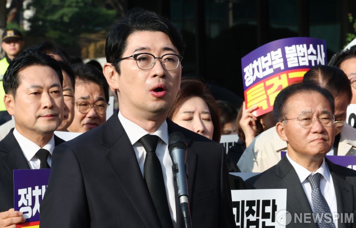 [서울=뉴스핌] 최지환 기자 = 주진우 국민의힘 의원이 30일 오전 서울 서초구 서울고등검찰청 앞에서 열린 국민의힘 긴급의총에서 발언하고 있다. 2025.10.30 choipix16@newspim.com