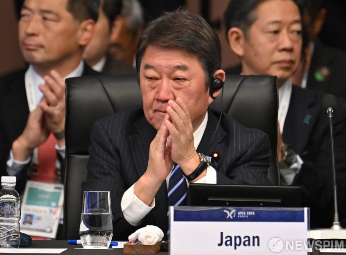 [서울=뉴스핌] 청사사진기자단 =모테기 도시미쓰 일본 외무대신이 30일 오전 경북 경주시 소노캄 경주 그랜드볼룸에서 열린 2025 APEC 외교통상합동각료회의 개회식에 참석하고 있다.2025.10.30 photo@newspim.com