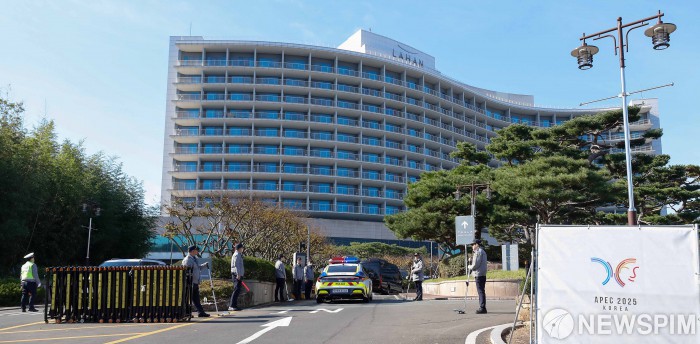[경주=뉴스핌] 류기찬 기자 = 아시아태평양경제협력체(APEC) 정상회의에 참석하는 다카이치 사나에 일본 총리 방한일인 30일 오전 다카이치 총리의 숙소로 알려진 경북 경주시 라한셀렉트 경주에 경찰 관계자들이 배치되어 있다. 2025.10.30 ryuchan0925@newspim.com