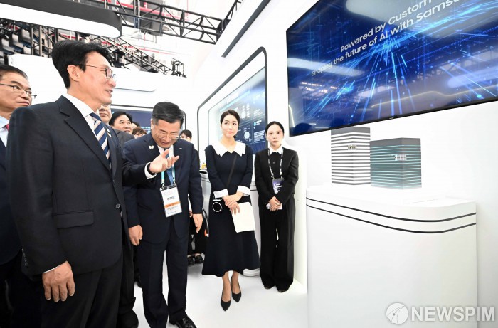 [경주=뉴스핌] 윤창빈 기자 = 김민석 국무총리가 30일 경북 경주시 경주엑스포공원에 마련된 K 경제전시장과 K테크쇼케이스를 방문, 삼성전자의 HBM반도체 기술을 살펴보고 있다. 2025.10.30 pangbin@newspim.com